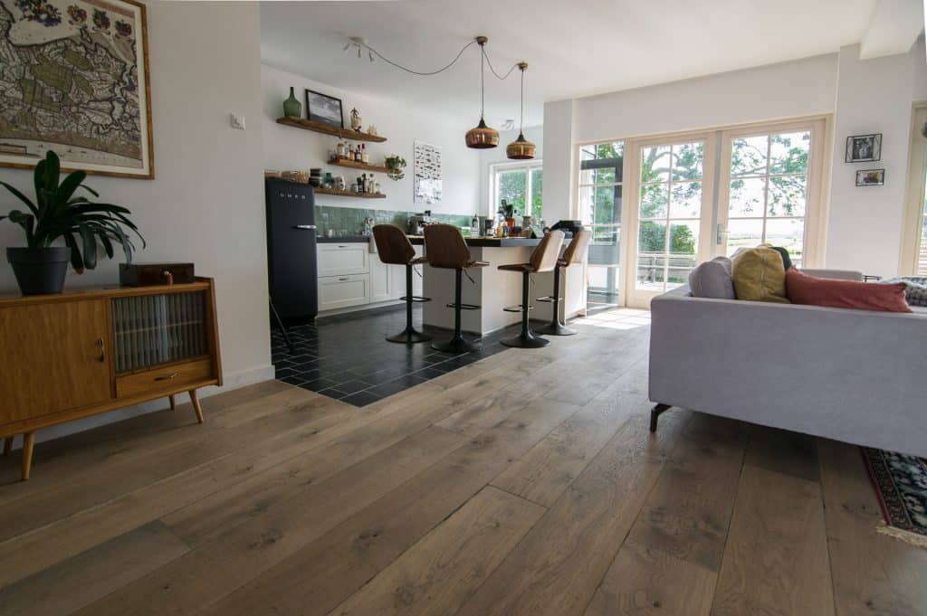 Na het toepassen van deze bewerkingen is de vloer 2x machinaal geolied. Hierdoor heeft de vloer een goede en sterke beschermlaag en kan je na het leggen direct op de vloer leven. Door het karakter van deze vloer is deze geschikt voor iedere leefsituatie en ook om door te leggen in de keuken.