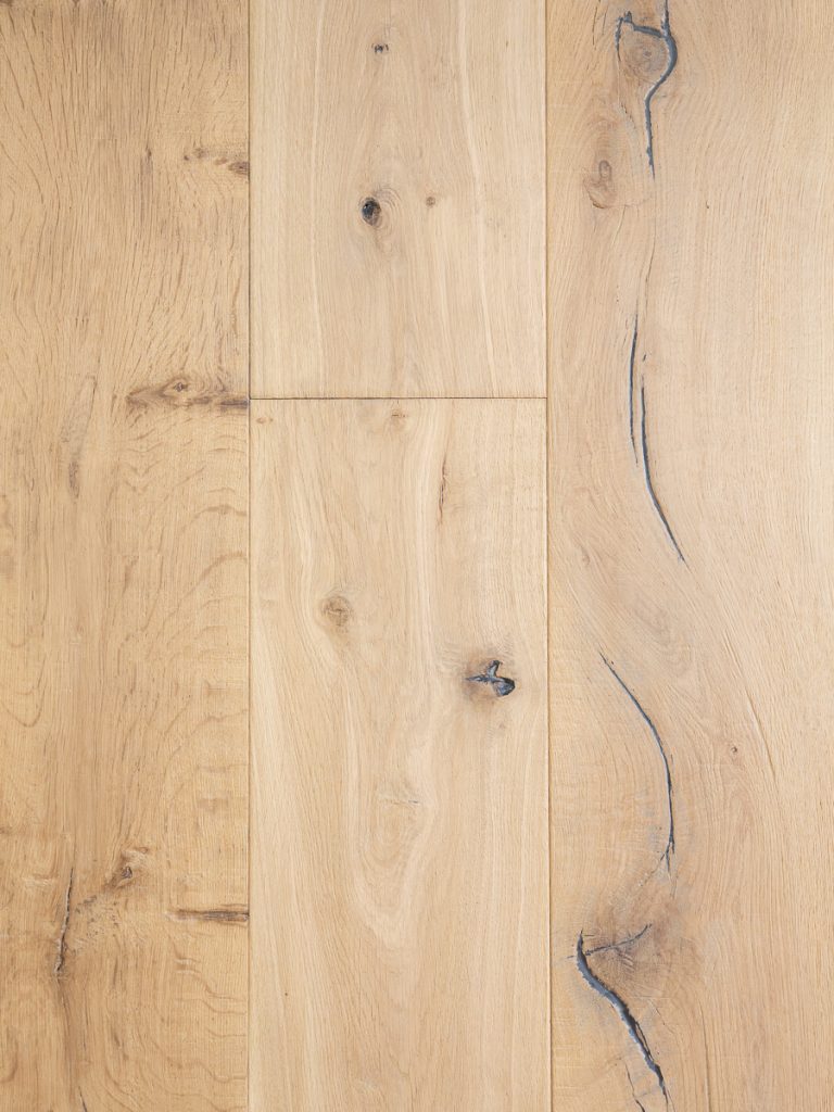 De vloer zelf is werkelijk bijzonder. De verouderde afwerking met subtiele butsen, deuken en gesplinterde randen geeft de vloer een authentiek en doorleefd karakter, terwijl de witte basis zorgt voor een lichte, rustige uitstraling. Je ziet én voelt dat dit een ambachtelijk en arbeidsintensief afgewerkte vloer is.
